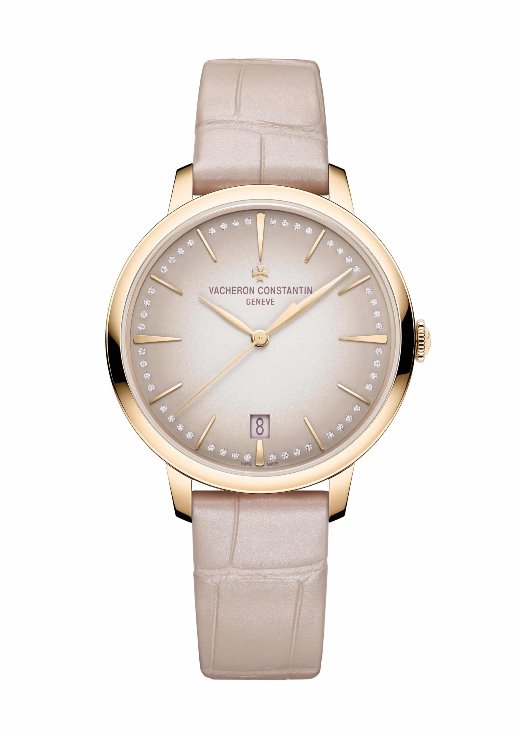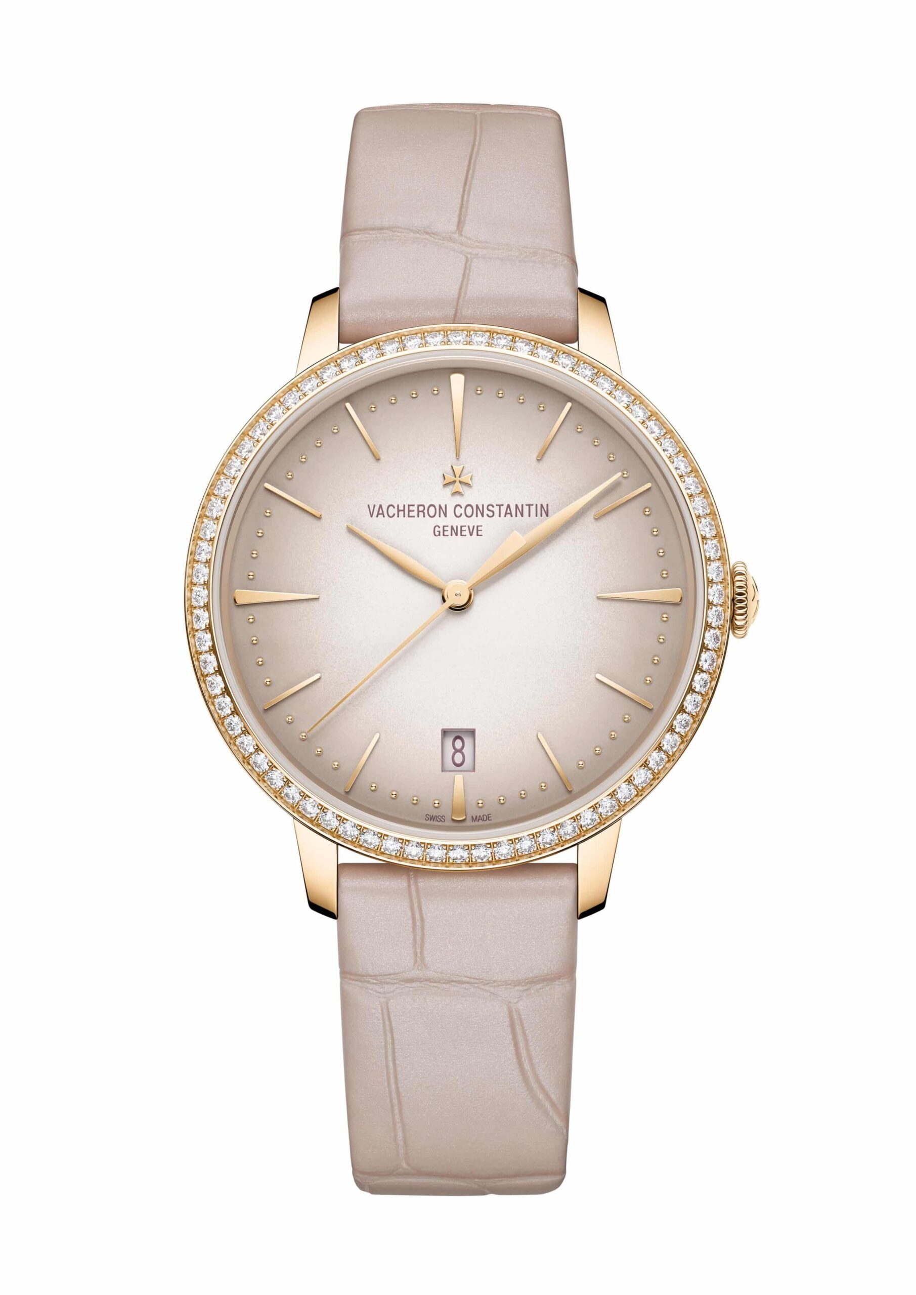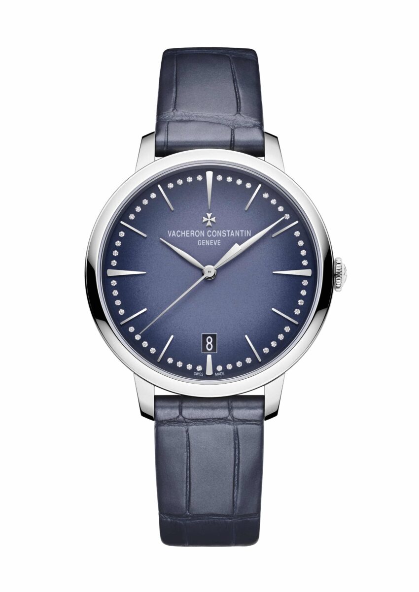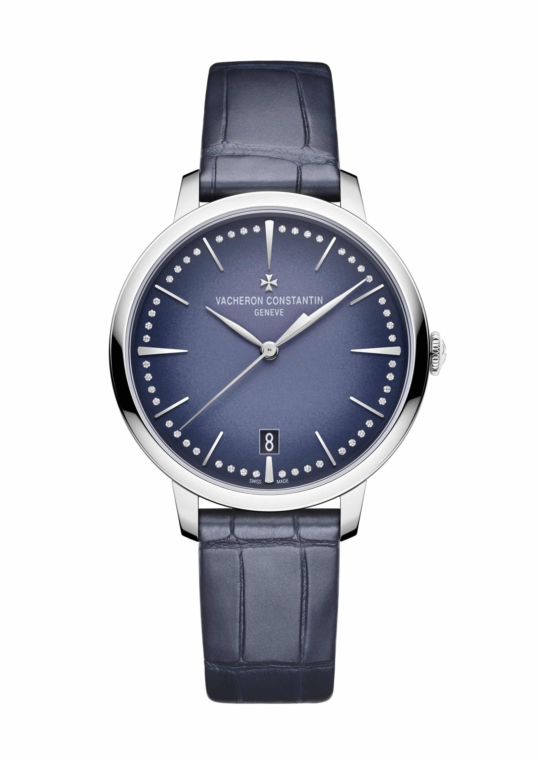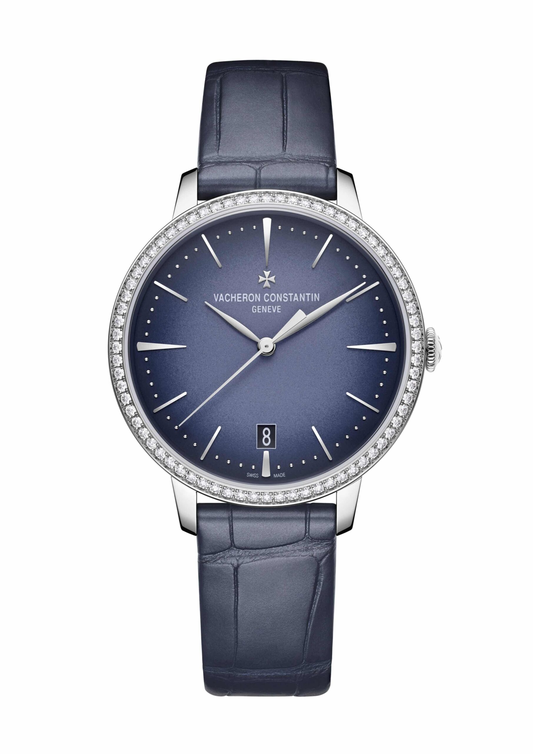 Estos nuevos relojes Patrimony cuentan con correas intercambiables en piel de aligátor azul noche o beige rosado con un acabado satinado iridiscente. Se pueden quitar y reemplazar con solo tocar un botón, sin necesidad de ninguna  herramienta.