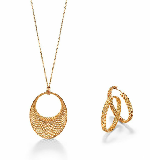 La serie Diamantissima, cuyo origen se remonta a la inspiración del tejido Diamante Canvaz de la década de los 30, exhibe la artesanía y el código de diseño italiano mediante un trabajo de intrincada orfebrería, que ofrece variantes al típico colgante curvo y a los aretes que lo acompañan. Debemos mencionar también, que fiel a su historia y a las nuevas tendencias de color y materiales, las piezas se presentan en oro amarillo o rosa de 18 quilates y están disponibles ya sea en 35 o 50 mm de diámetro según su complexión o gusto personal.