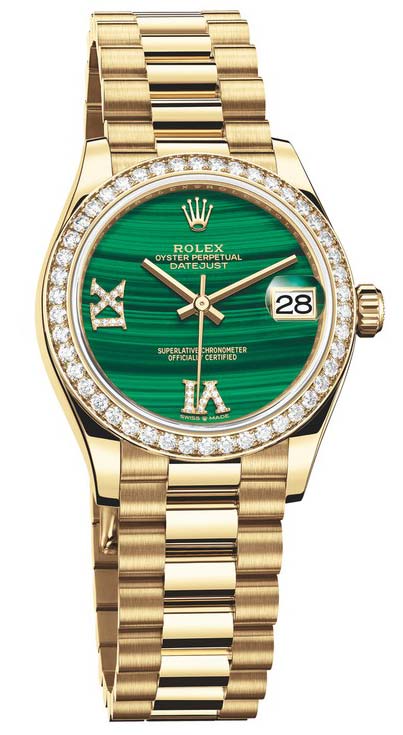 Hecho en caja de oro amarillo de 18 quilates a juego con el brazalete, esta referencia indica las horas, minutos, segundos y fechador con total precisión y belleza. Cuenta con una carátula de malaquita con indicadores aplicados en números romanos para el VI y las IX. La caja se extiende hasta los 31 mm de diámetro y luce un bisel de oro amarillo de 18 quilates con engaste de 46 diamantes talla brillante. Finalmente, el calibre es el 2236 de manufactura, por supuesto.