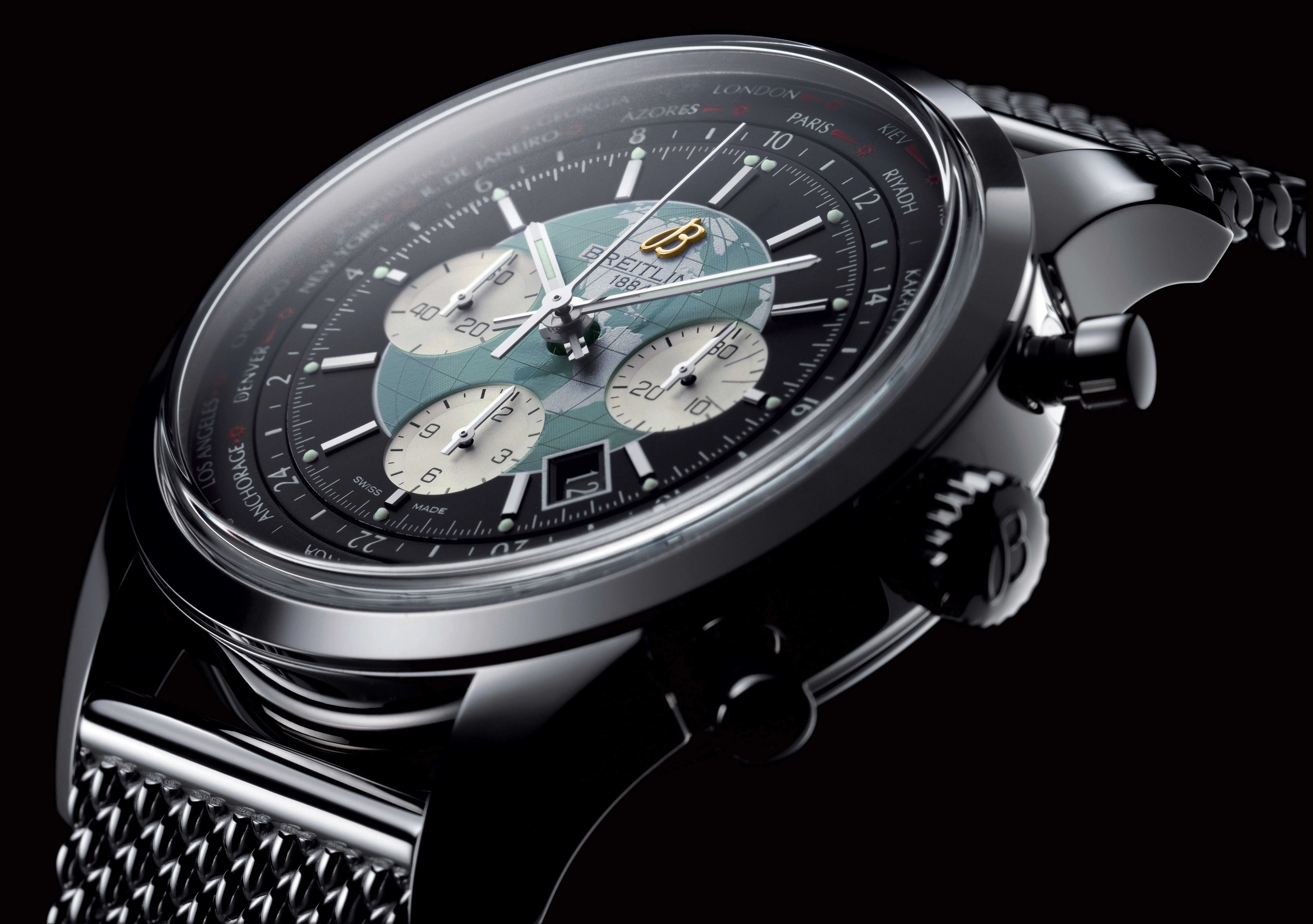 Dotado de un nuevo y patentado mecanismo, íntegramente desarrollado y fabricado en los talleres de Breitling, el novedoso cronógrafo indica en todo momento y simultáneamente la hora en los 24 husos horarios. Dicha innovación permite que el viajero corrija con un solo movimiento todas las indicaciones girando simplemente la corona al llegar a su destino.