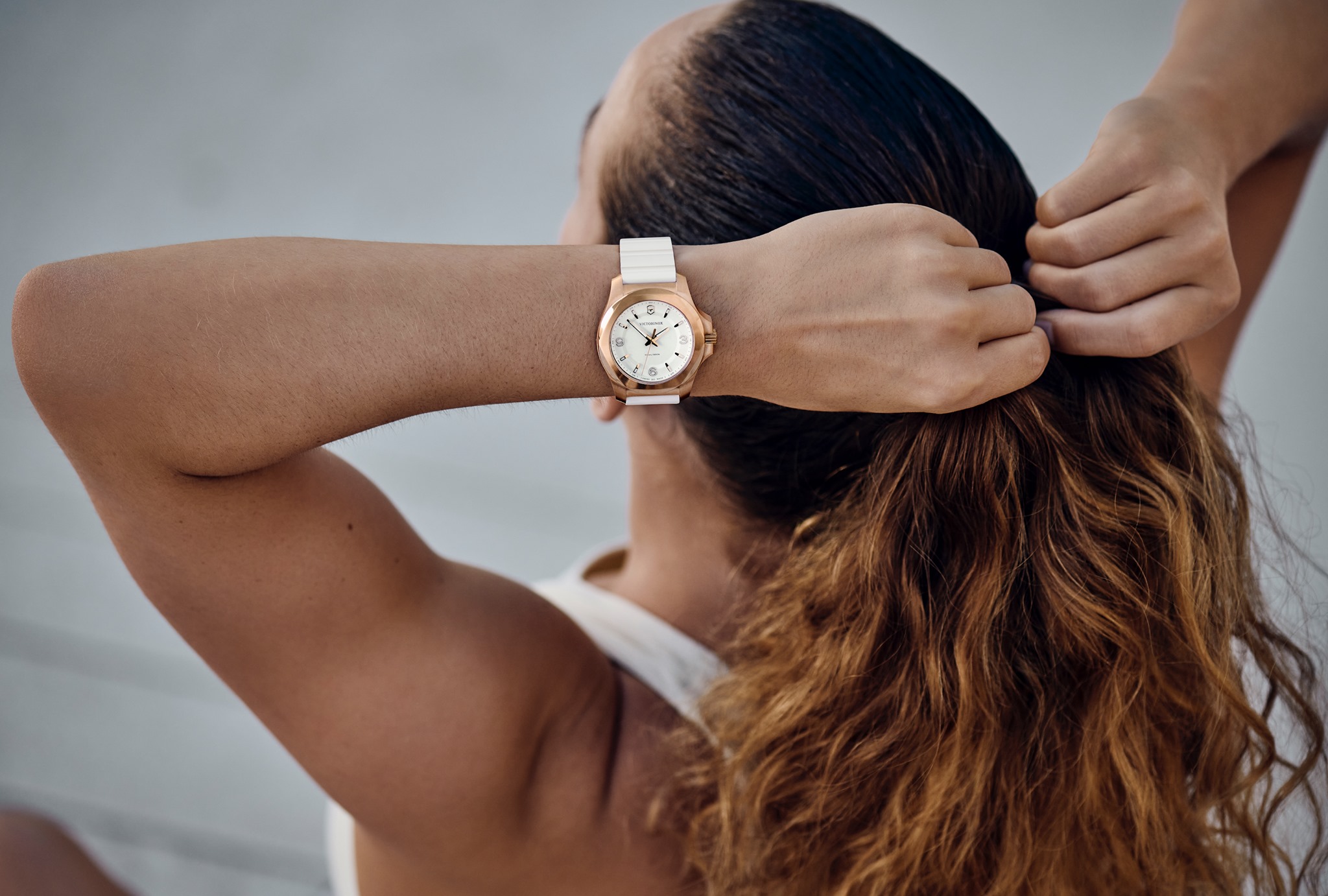 Presentado en tonos gris, blanco, negro, azul y rosa, dentro de la frescura de una caja acero inoxidable u oro rosa (PVD), el icónico bumper protector se suma como accesorio elegante, que cambia el aspecto del reloj y ofrece protección adicional a la vez.
