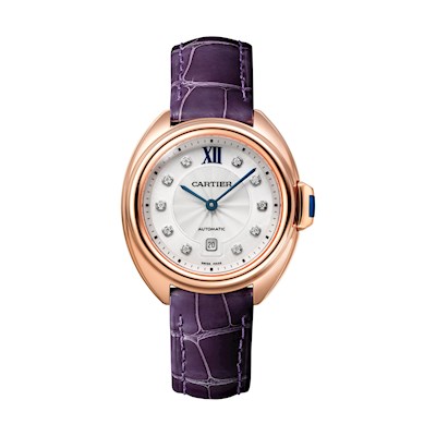 –Clé de Cartier llega a nuestro país en configuración de oro rosa (caja y brazalete) con engaste de diamantes, además presenta nuevos colores para las correas. Destaca el espectacular morado para la piel de cocodrilo, pero también el nivel de personalización que puede adquirir de acuerdo a la predilección de su selecta clientela, que podrá solicitarlo con total libertad en el punto de venta autorizado.
