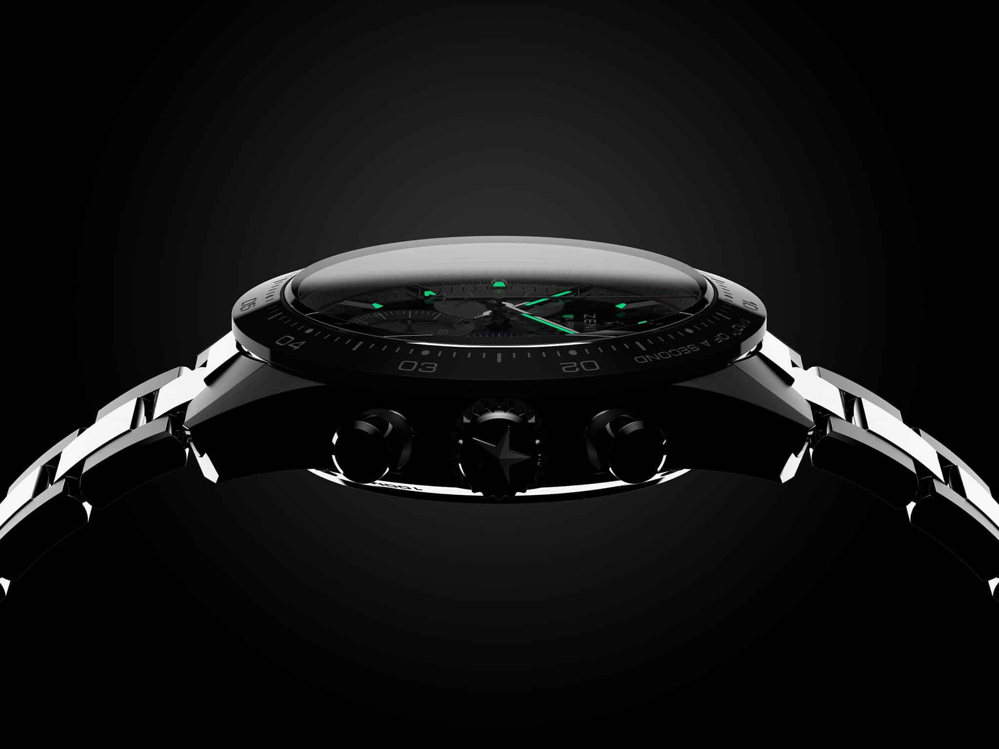 El cambio más notable es la adición del bisel de cerámica negro con escala a 1/10a de segundo, con lo cual la durabilidad y permanencia inalterable del modelo mejora sustancialmente. En cuanto a la carátula, el estilo tri-compax permanece, con un totalizador de 60 minutos, otro para 60 segundos y uno más que se suma como pequeño segundero.