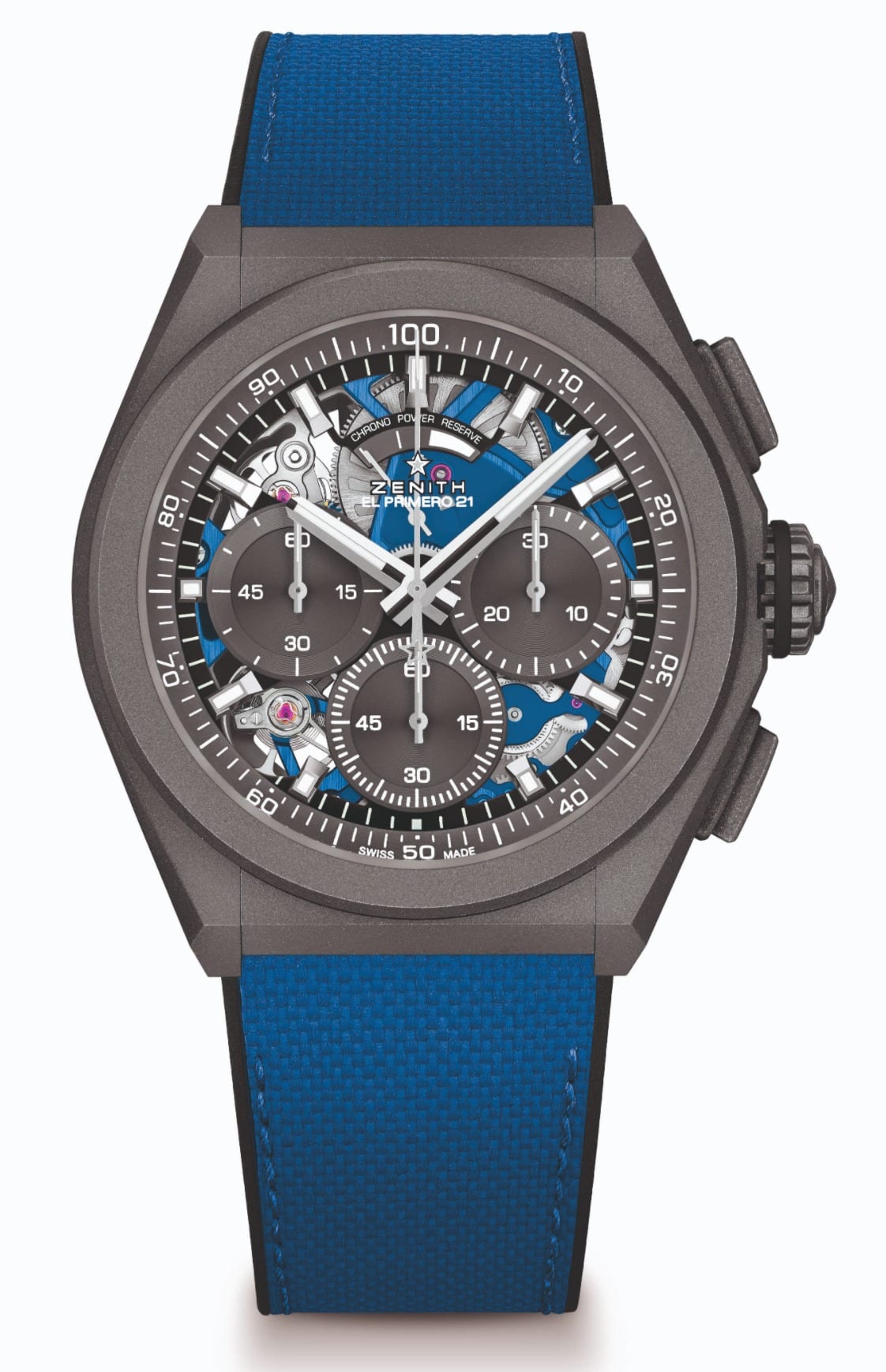 La carátula –parcialmente abierta– presenta contadores de cronógrafo cerrados ligeramente superpuestos, con un acabado en tono gris a juego con el gris intenso de la caja, que presenta marcas blancas en contraste para mejorar su legibilidad. El movimiento de color azul vivo se ve acentuado por el diseño singular y vanguardista del movimiento del Defy 21, con puentes abiertos y angulares. La aguja del cronógrafo central con punta blanca e indicación de las centésimas de segundo realiza una vuelta completa por encima del dial en un segundo.