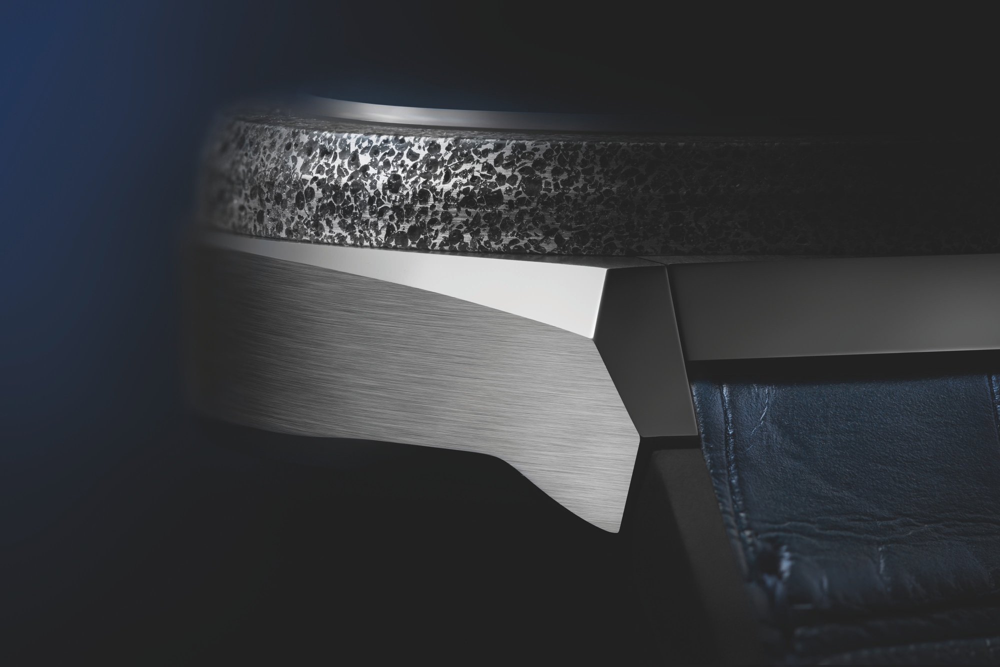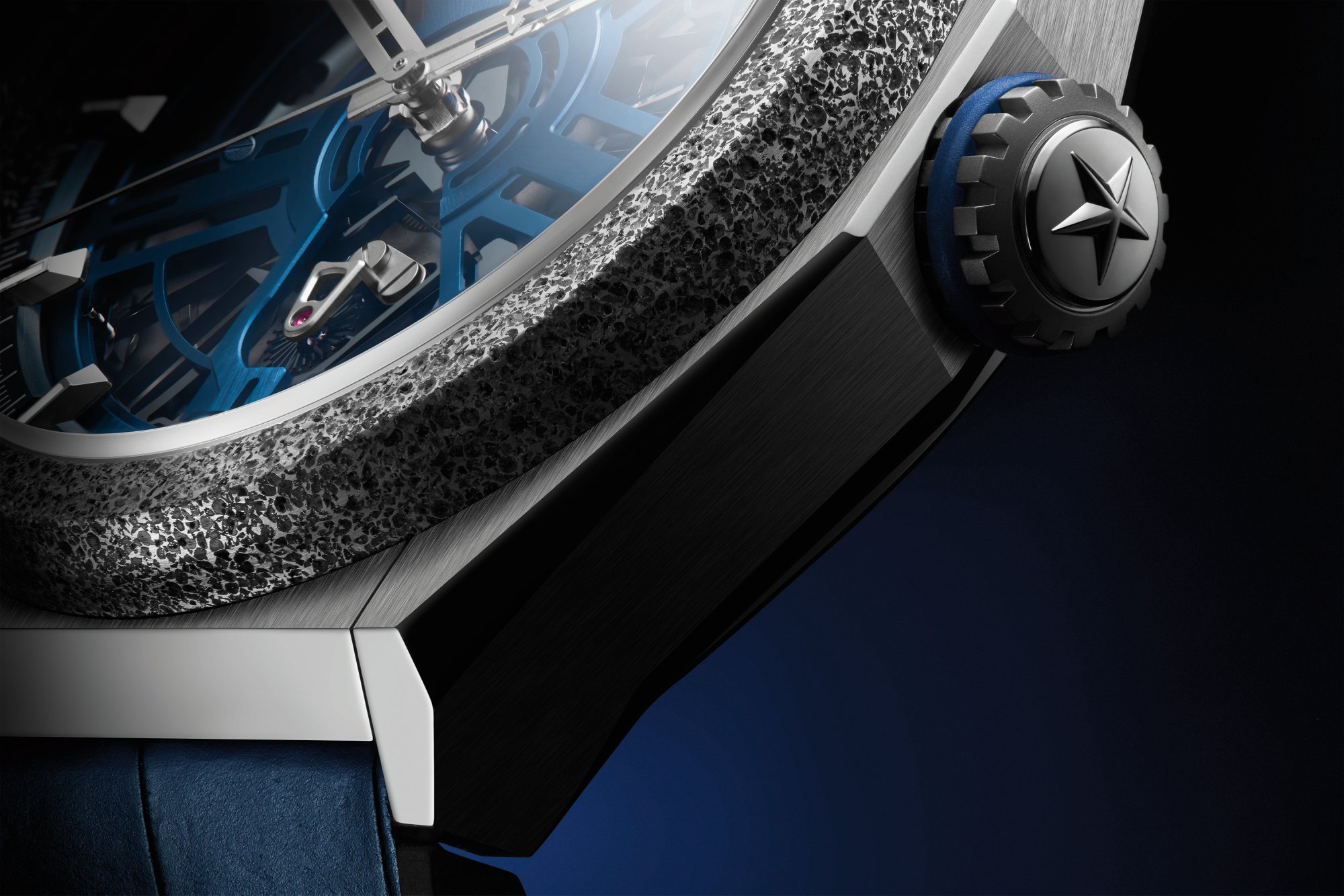 La pieza se ofrece en caja de 44 mm de diámetro x 14.5 mm de perfil, y está desarrollada en titanio con bisel de Aeronith. La carátula es color azul y presenta agujas con tratamiento luminiscente y hermeticidad hasta los 50 metros de profundidad.
