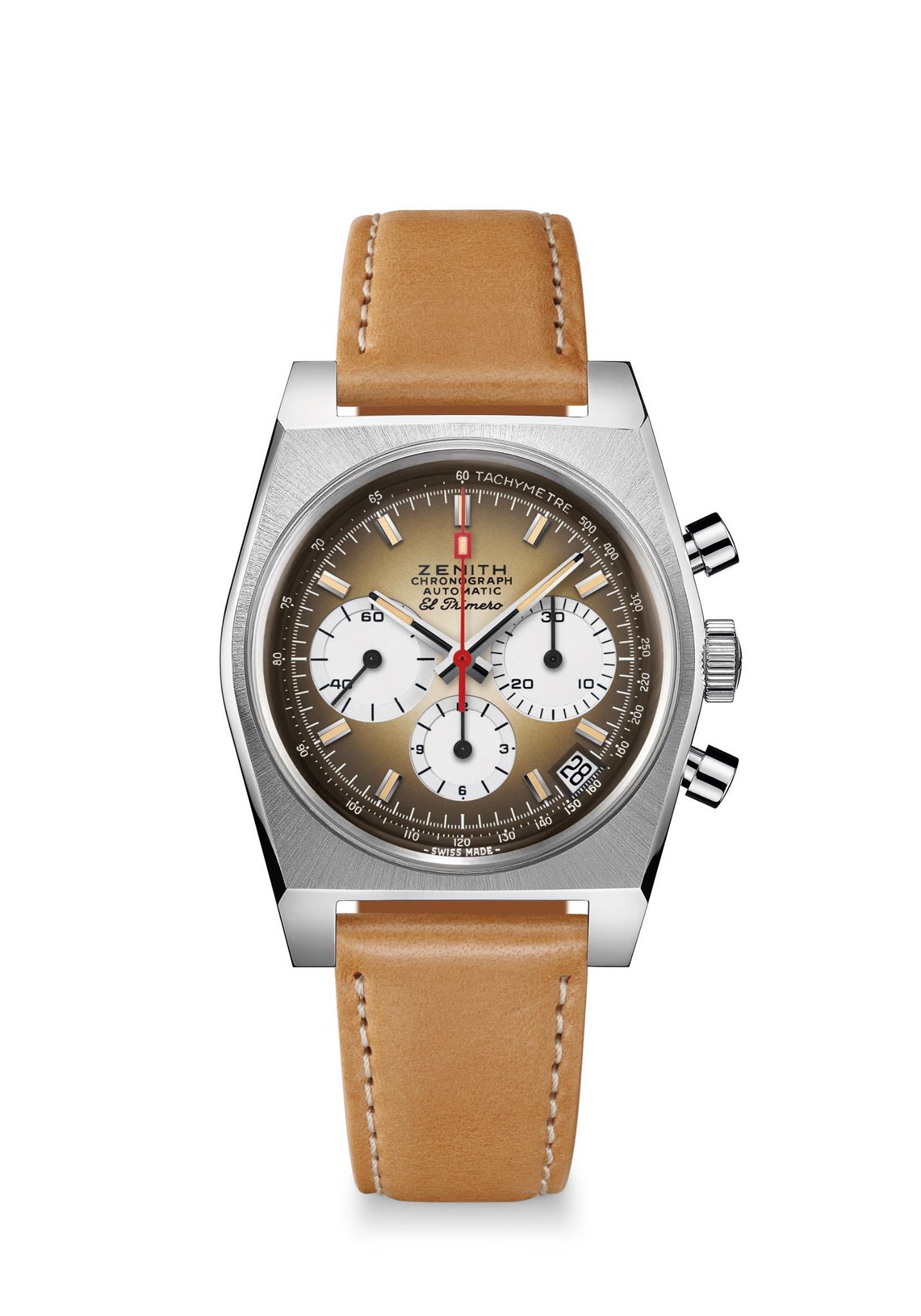El Chronomaster Revival A385, fiel a la temática retro, está disponible en dos opciones que podrían proceder directamente de 1969: la primera es el brazalete escala de acero, una versión moderna de los brazaletes de Gay Frères, que se convirtieron en el emblema de los primeros relojes El Primero. La segunda opción es una correa de piel de becerro marrón claro que desarrollará una pátina única con el uso y el paso del tiempo.