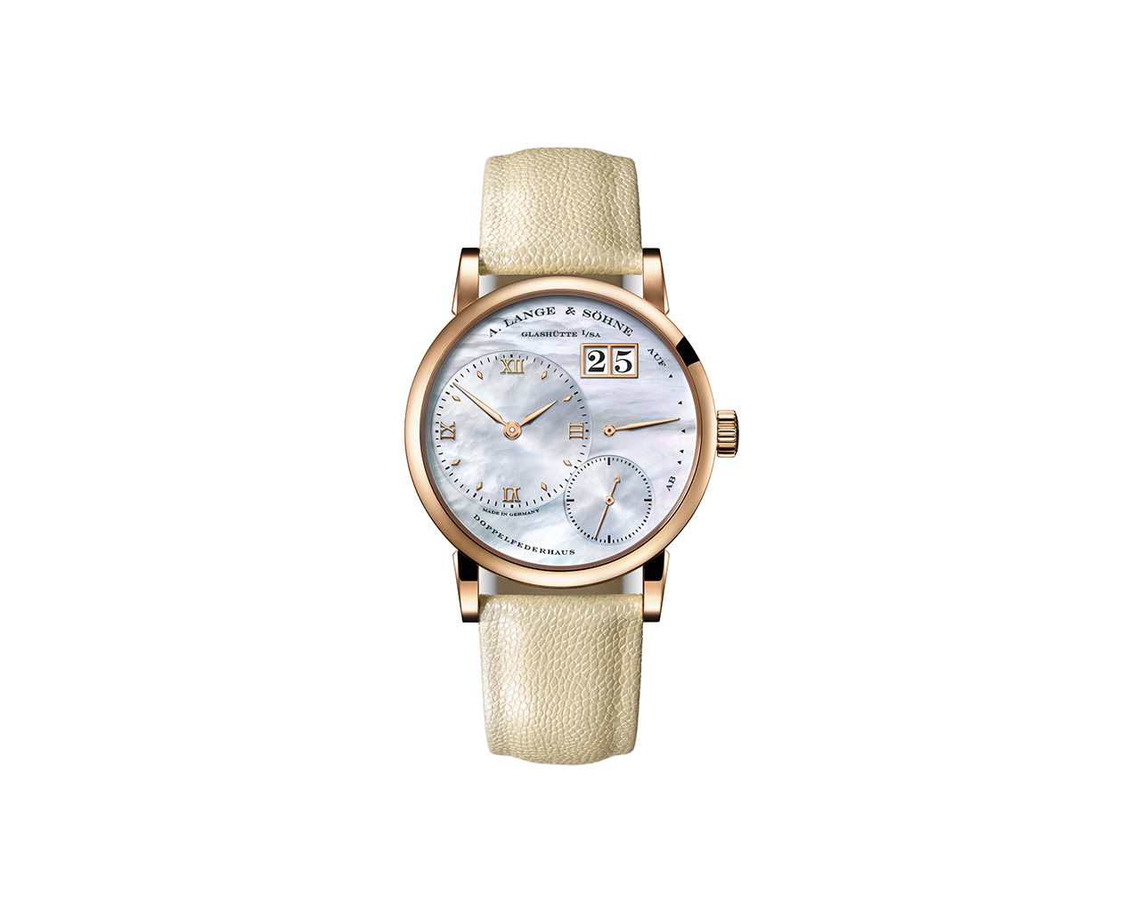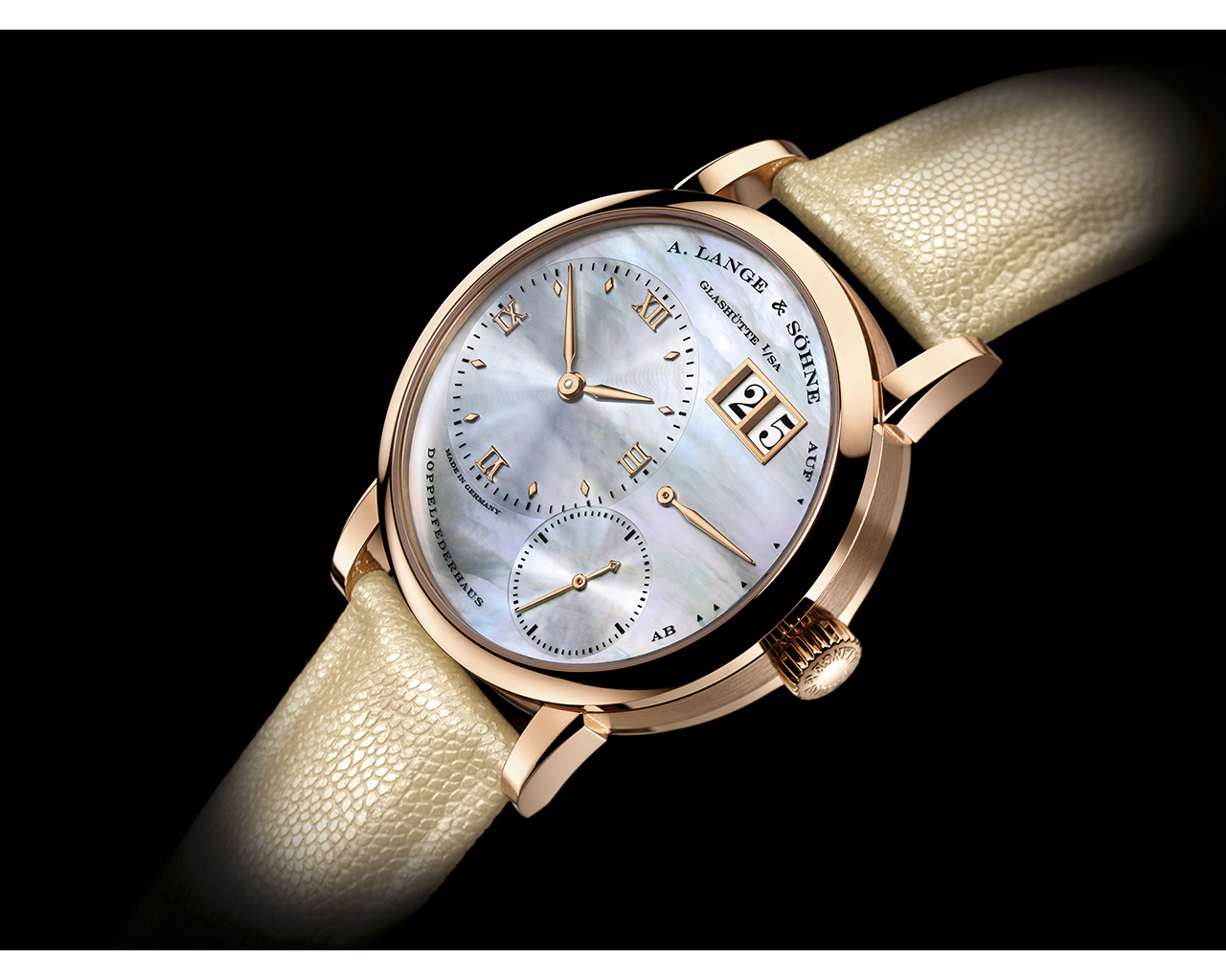 Little Lange 1: la configuración tradicional del Lange 1 inspira a una pieza con dicha exhibición pero destinada a la mujer. En caja de 36 mm de oro rosa o blanco, sobresale la carátula madreperla y la artesanía relojera en cada uno de sus detalles. Una pieza que exhibe el caminar de las horas, minutos, segundos, gran fechador y reserva de marcha.