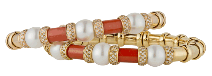 - Brazaletes de oro amarillo y oro rosa respectivamente con coral, perlas y brillantes.