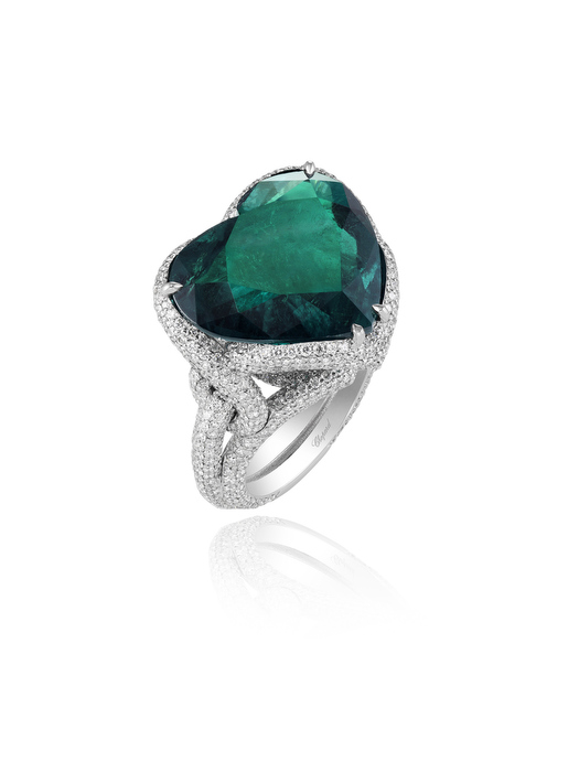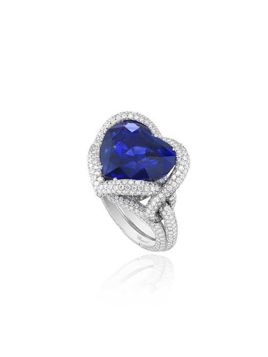 Para cada una de ellas la casa ginebrina ha elegido unas gemas de incomparable esplendor. La esmeralda y el zafiro se unen a la fiesta de los enamorados. Estas piedras, montadas en sortijas de oro blanco, talladas en resplandecientes corazones, parecen surgir de un entrelazado de diamantes.