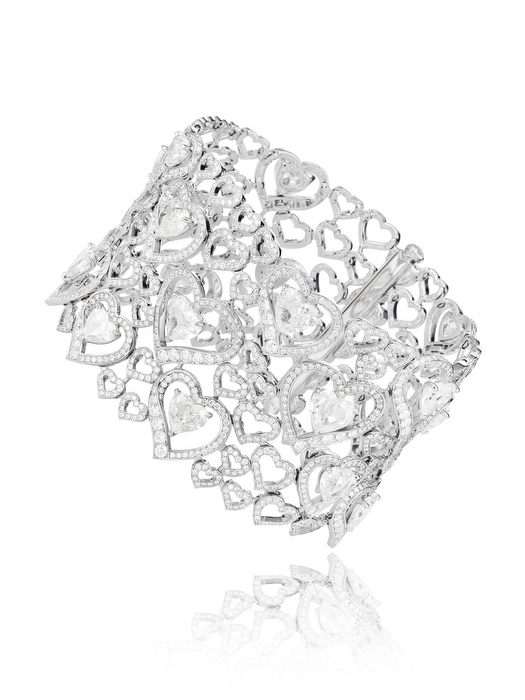 En cuanto a la más famosa de las piedras preciosas, mantiene el puesto de honor en este resplandeciente brazalete de gran delicadeza. Se trata de un auténtico encaje realizado en oro blanco y formado por corazones delicadamente tallados y engastados de brillantes, entre los que destacan unos magníficos diamantes talla corazón.