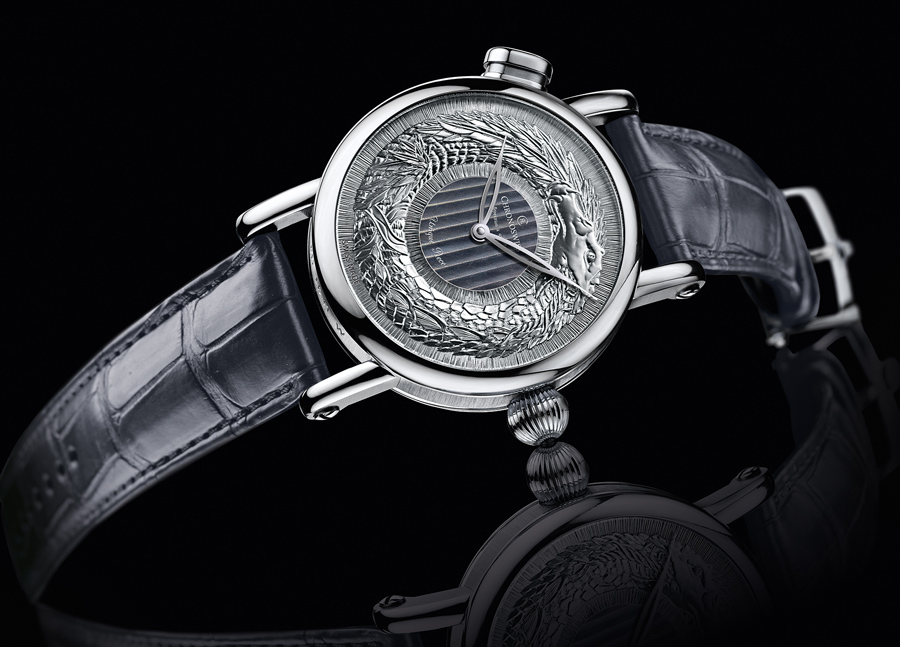 Al centro parten dos manecillas para la indicación de las horas y minutos, mientras que la escena se la roba una serpiente que pareciera comerse su propia cola, un simbolismo del Antiguo Egipto que representaba la unidad eterna y el renacer a partir de una unidad cósmica que regía al universo.