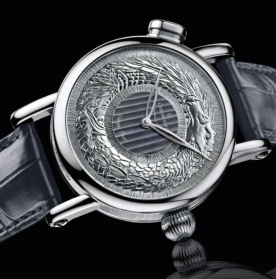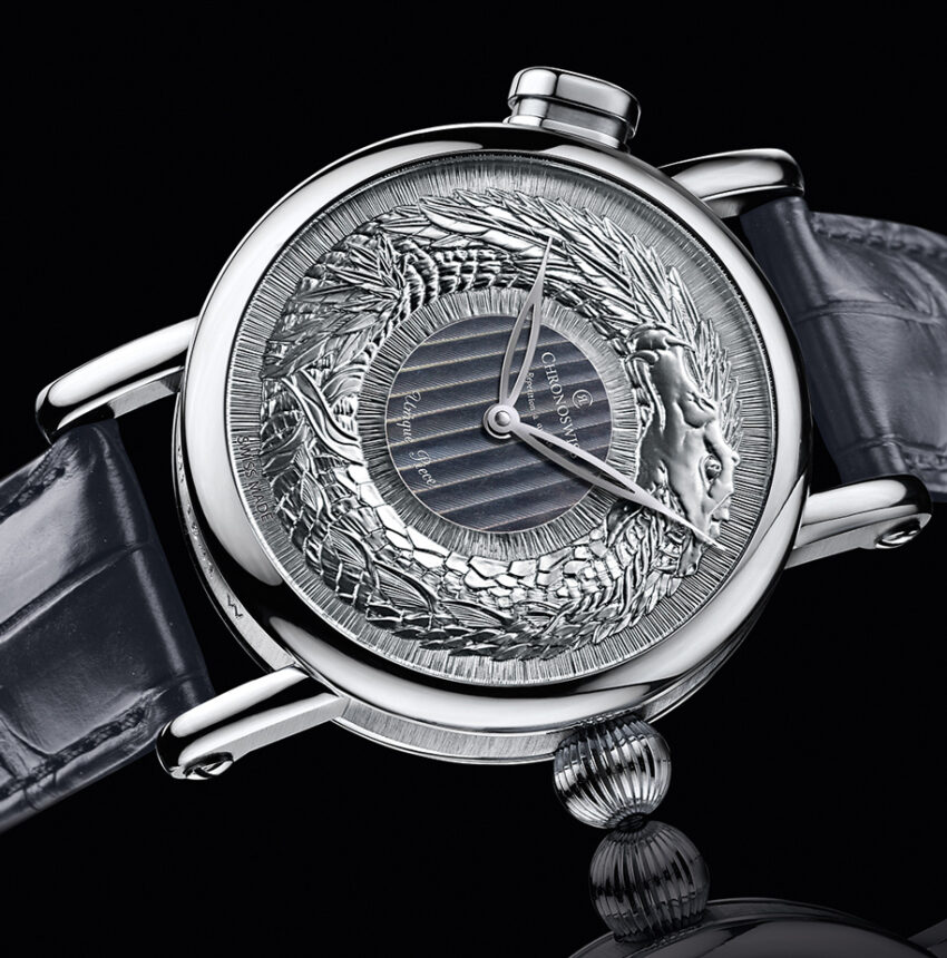 Muy a su estilo y expertise, Chronoswiss es amo del trabajo de guilloché en las carátulas, y es así que en esta ocasión y con motivo de la subasta bienal