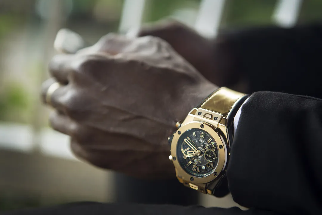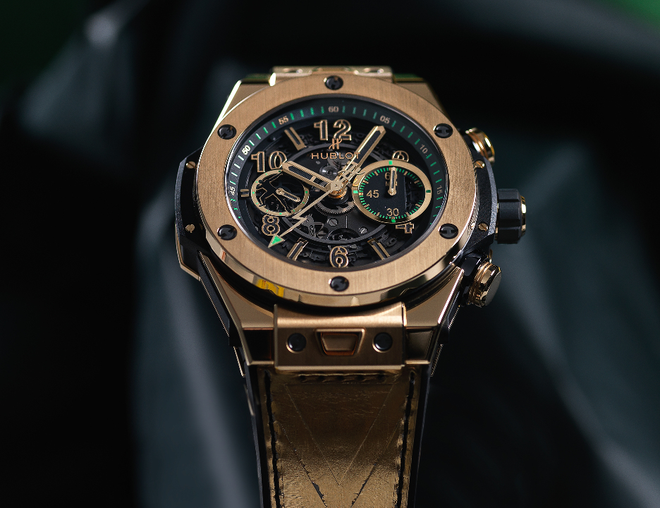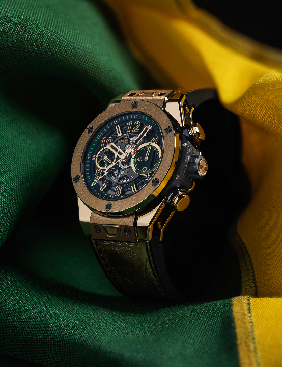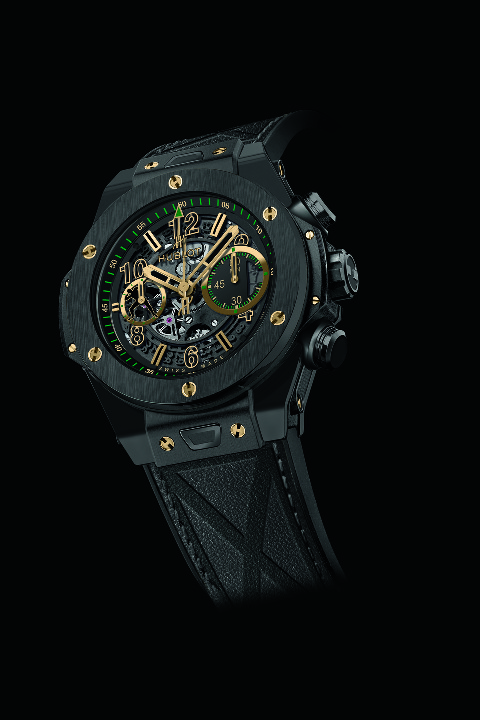 El Big Bang Unico que se le ofreció a Usain Bolt es un modelo lanzado en dos ediciones limitadas con una caja de 45 mm en oro amarillo o cerámica negra. Los segundos de este cronómetro cuentan el tiempo por medio de una aguja en forma de relámpago, su diseño destaca por los toques de verde, oro y la bandera jamaicana que adorna la correa. Su caja de zafiro cubre el movimiento interno único y se engalana con la silueta de un relámpago esmaltado.