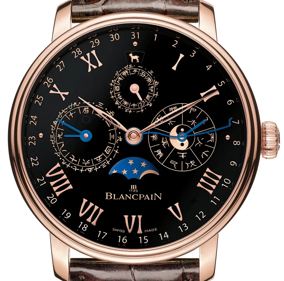 Sus funciones incluyen: horas, minutos y calendario gregoriano con las indicaciones de los meses intercalados, signos del zodiaco, así como los cinco elementos y los 10 troncos celestes. La combinación de estos últimos con los animales del zodiaco representa las ramas terrestres, sigue el ciclo sexagenario central de la cultura china. Por si fuera poco, las fases de Luna –elemento clave de los calendarios perpetuos de Blancpain– se encuentran presentes mediante una abertura en la carátula, y desempeñan un papel preponderante dada la vinculación entre el ciclo lunar y los meses chinos tradicionales.