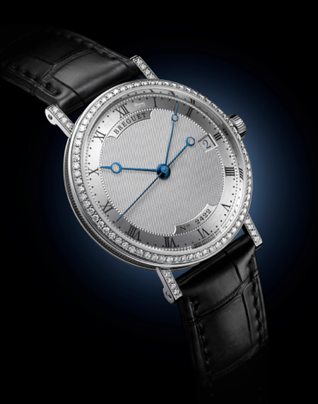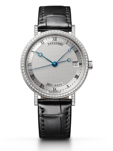 Classique Dame, un reloj de perfil delgado, muestra las horas, minutos y segundos, así como la fecha por apertura en la carátula. Una vez más, el corazón de este reloj es un movimiento mecánico con espiral y rueda de balance de silicio, prueba total de la ejecución de Breguet en el ámbito de la precisión y la belleza estética. Asimismo la carátula guilloché, se exhibe como principal atractivo del dial, mientras que el bisel y asas albergan un engastado precioso con diamantes talla brillante.