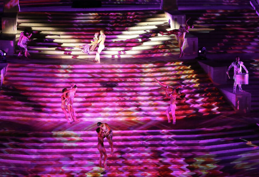 Siendo un noche memorable llena de música y luces, la Escalinata de la Plaza de España se presentó al momento de despojar una tela con textura de azafrán que se encontraba tendida a lo largo del monumento por una mujer que dejó a la vista la belleza y resplandor del monumento. Posteriormente la coreografía del teatro de baile Kataklò, estremeció a cada uno de los invitados presentes con diferentes acrobacias, atletismo, sonido y luces.