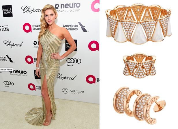 Katheryn Winnick, quien en la edición número 23 de la Annual Elton John AIDS Foundation Academy Awards Viewing Party, lució un brazalete y un anillo DIVA de oro rosa de 18 quilates con diamantes en pavé y perla madre, y unos aretes B.ZERO, también de oro rosa con diamantes en pavé.