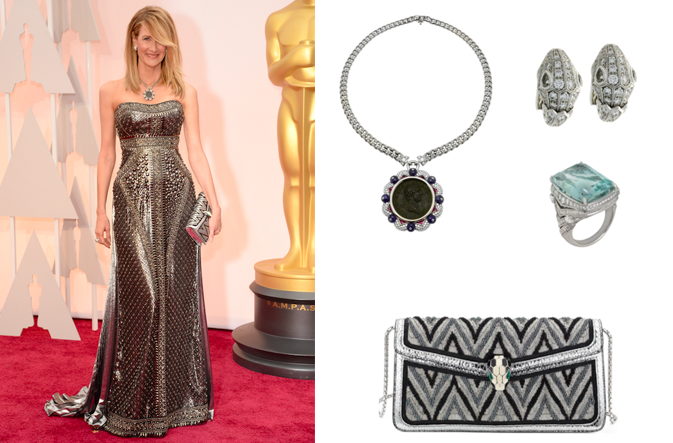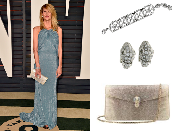 Laura Dern nos dejó fascinados en la ceremonia de los Oscar con un collar MONETE de oro blanco con zafiros, rubíes y diamantes en pavé, aretes SERPENTI en oro blanco con diamantes en pavé y de corte brillante, un anillo con aguamarina y diamantes, y una bolsa de noche SERPENTI FOREVER para dar el toque final a su atuendo. Para la fiesta de Vanity Fair, repitió los aretes, pero llevó un brazalete de oro blanco con diamantes en corte brillante y en pavé y una bolsa SERPENTI.