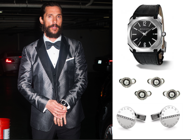 Mathew McConaughey, un hermoso reloj BVLGARI OCTO Solotempo de caja de acero de 41 mm, con carátula negra y una correa del mismo color de piel de cocodrilo, complementando con cubre botones y mancuernillas BVLGARI-BVLGARI.
