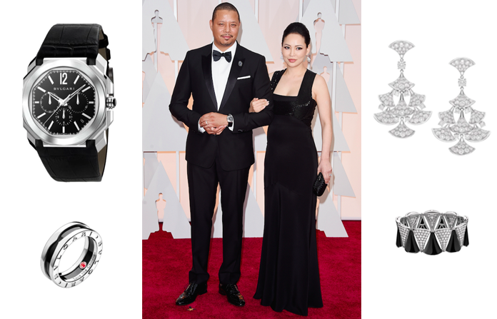 Terrence Howard y su esposa Mira, el actor portó un reloj BVLGARI OCTO Velocissimo Chronograph y un anillo BVLGARI / SAVE THE CHILDREN de plata y cerámica negra, cuyos ingresos van a la caridad Save The Children. Hasta ahora la campaña ha juntado más de 35 millones de dólares y ayudado a más de 600 mil niños alrededor del mundo. Su esposa llevó unos aretes y un brazalete DIVA.