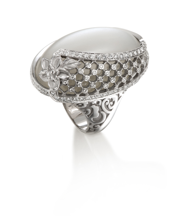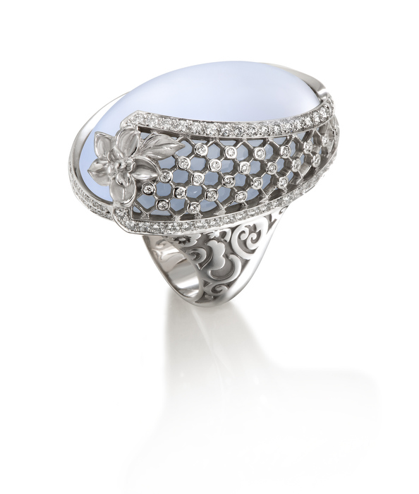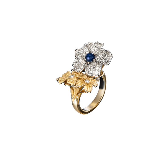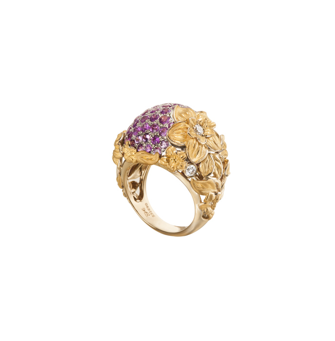 Las joyas se presentan como flores con pétalos de diferentes tamaños que aportan realismo a las piezas así como volumen. La transparencia en las piedras preciosas deja ver todo el trabajo minucioso del interior de la pieza creando un efecto lupa de forma que se magnifica y aprecia cada detalle de manera extraordinaria.