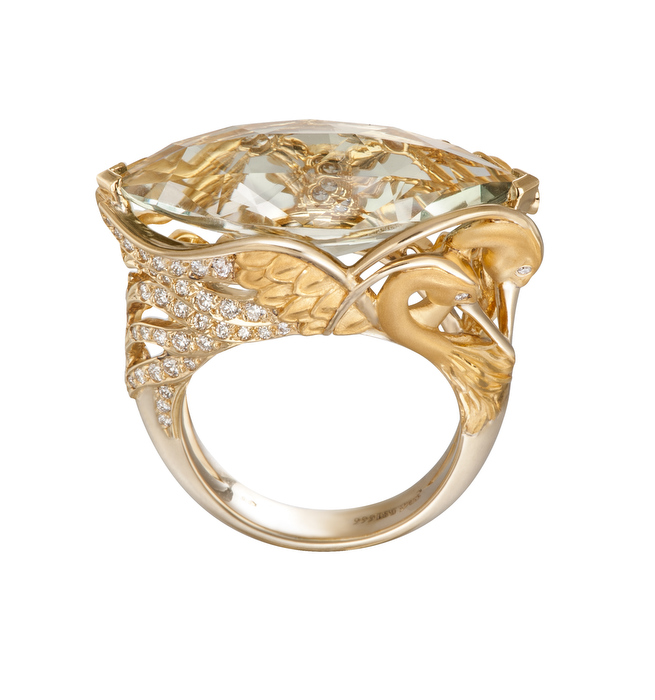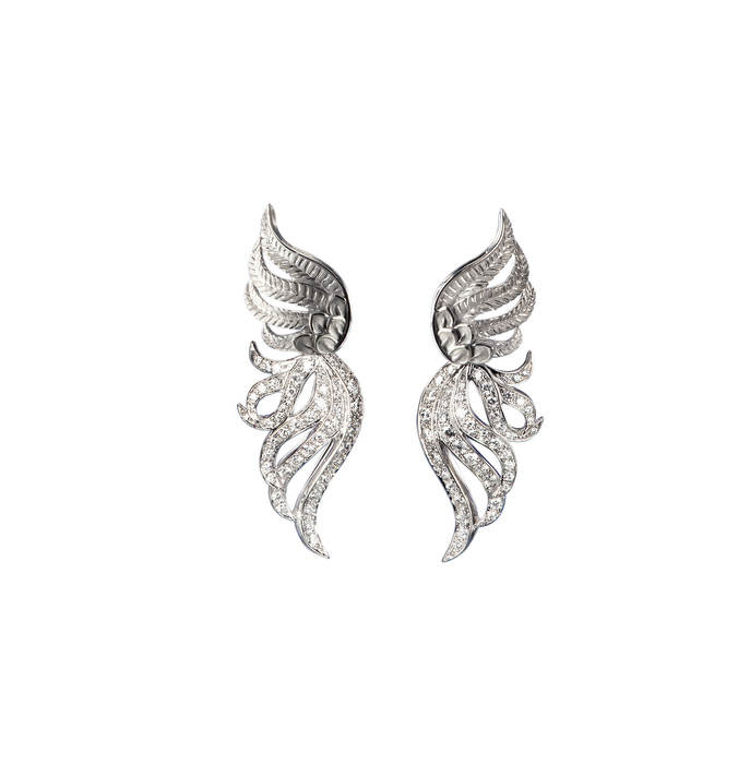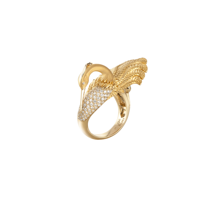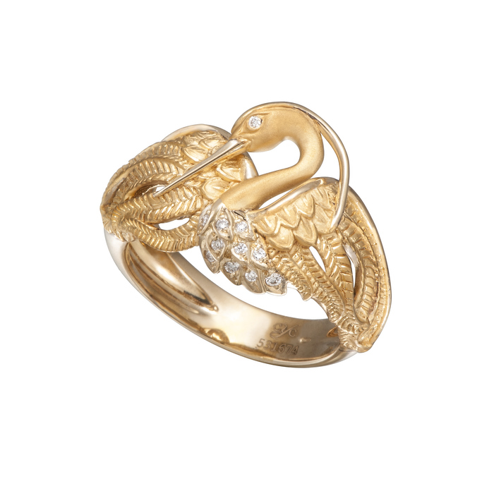 Piezas cargadas de gran simbolismo que emulan la sinuosidad del Mantón. Ligeras, con calados, asimétricas y trabajadas con mucho detalle, las garzas parecen bailar en el estanque. Joyas que nos hacen volar a un mundo lleno de secretos y pasiones ocultas.