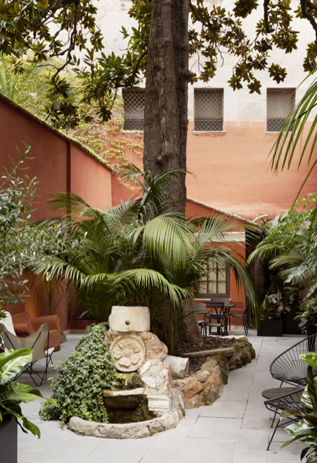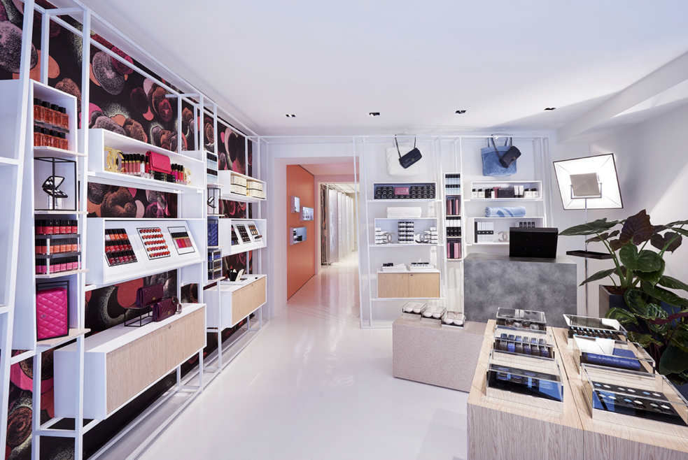 El edificio cuenta con la tradicional arquitectura romana, exhibiendo una fachada que da entrada a otro mundo, uno lleno de luz, fragancias y brillo, pero por fuera nos remite a los años clásicos de la alta sociedad romana. En el interior, los pisos y techos blancos combinan con módulos de hormigón estableciendo una escena que está unisex. Continuando en la misma línea, los muebles de alambre de metal blanco y negro evocan a la geometría, jugando con todo tipo de formas de perspectiva en tercera dimensión sin un solo ángulo recto. Las paredes con motivos vegetales dibujados en lápiz de color sobre un fondo negro o blanco explotan con tonos verdes aquí y brillantes tonos rosados allí.