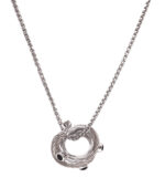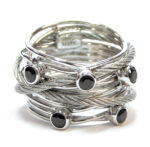 Por su parte, los anillos y pendientes a juego continúan con el tema entrelazado y se ofrecen en un trío a juego en plata y negro, oro rosado y blanco, o plata con un cable blanco y piedras blancas. Coordinando los pendientes y collares se puede hacer un impacto dramático, con anillos entrelazados colgados de una cadena de 45 cm.