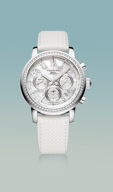 - El Mille Miglia Chronograph, elaborado en acero inoxidable, su diseño evoca la belleza de los autos de colección. Gracias a su bisel con pavé de diamantes, su carátula en madre perla –inspirada en un tablero de auto clásico– y a su cronómetro certificado como máquina, Chopard logra combinar a la perfección el diseño de autos con la mecánica del quehacer relojero.