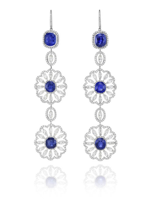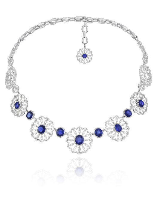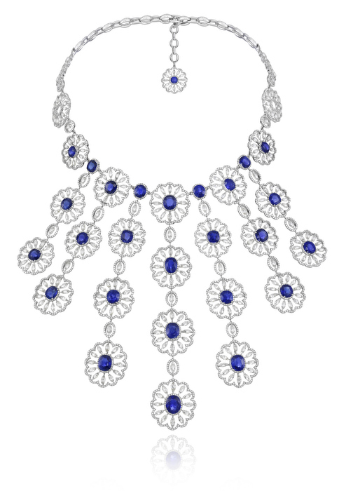 Su magnifico plastrón de oro blanco de 18 quilates está engastado con más de 300 diamantes talla cuentas nizam (66 cts), con más de 2,600 diamantes talla brillante (13 cts) y con 27 zafiros azul profundo (56 cts). Este refinado aderezo seduce también a causa de su carácter modulable. En efecto, las siete hileras de su collar son fácilmente desmontables y esto permite crear otro collar a ras del cuello. Los pendientes a juego, formados por dos zafiros y diamantes engastados, ofrecen cada uno de ellos la posibilidad de adaptar un fleco. Una delicada sortija de oro blanco de 18 quilates con un zafiro y diamantes engastados completa este aderezo, que demuestra una vez más, que todo el arte de Chopard reside en su capacidad de crear piezas tan inesperadas y tan maravillosas de contemplar, como emocionantes de llevar.