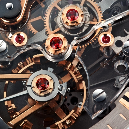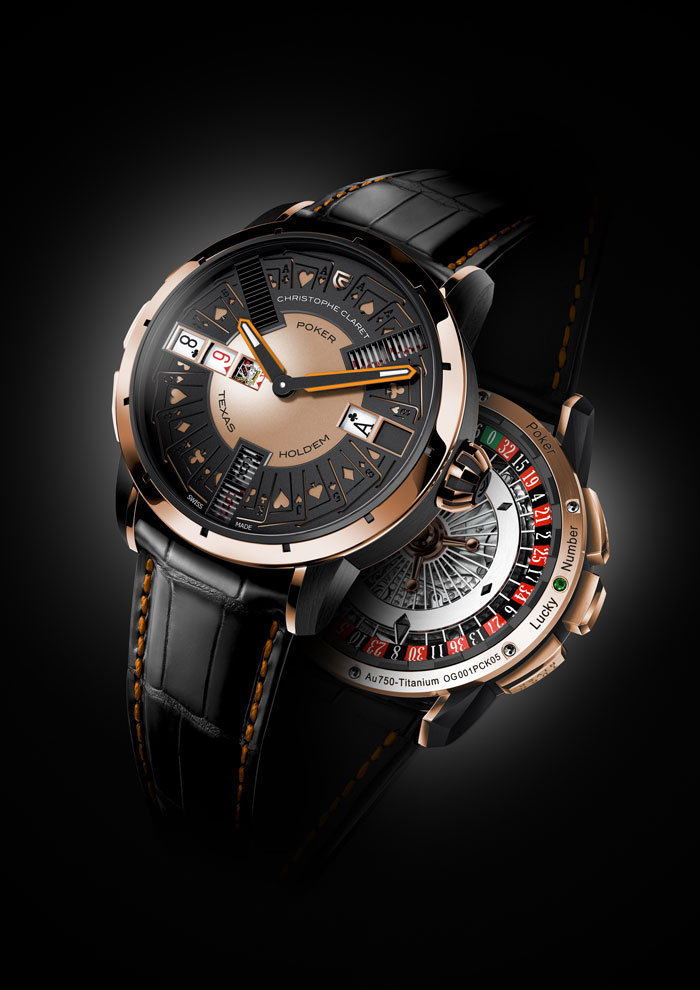 - Poker // Movimiento: mecánico automático / Calibre PCK05 / Frecuencia: 28,800 a/h / Reserva de marcha: 72 h / No. de piezas: 655 / Joyas: 72 / Funciones: horas y minutos; dos juegos: poker Texas Hold´em con timbres catedral patentados y juego de ruleta / Caja: 45 mm de oro blanco, oro rosa y titanio grado 5 / Carátula: esquematizada con motivo de cartas; agujas: de rubí rojo y PVD negro con Super-LumiNova®; cinco ventanillas en el tablero, 3 juegos y 2 ventanillas para los jugadores; sistema de persianas rodiado para proteger las cartas d ellos jugadores; reverso: ruleta en tercera dimensión con masa oscilante al descubierto / Correa: piel de cocodrilo color negro. Edición Limitada a 20 ejemplares por configuración.