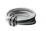 La colección Allegra de Grisogono logra combinar el cuero en cuatro diferentes colores –blanco, rosa, amarillo y negro– con diferentes piedras preciosas entre los que destacan los diamantes (blancos y negros) y los zafiros (naranjas, rosas) engastadas en aros de oro rosa, oro blanco y otros cubiertos con nanocerámica, novedoso material en la joyería.