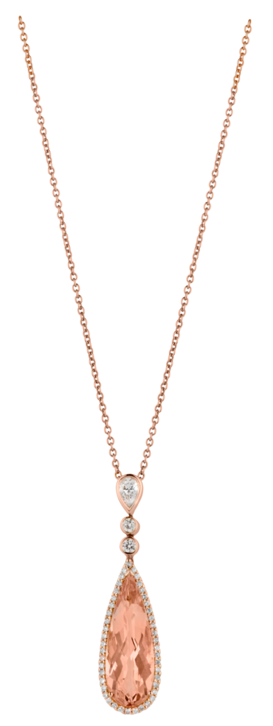 La morganita pertenece a la misma familia de la esmeralda, ambas son berilio sólo que de diferente color. La morganita es berilio rosa, una variedad muy escasa de la cual existen variantes amarillentas o anaranjadas. En este caso, como deliciosas gotas del miel, el naranja de la piedra se integra a la perfección con el oro rosa de la montura.