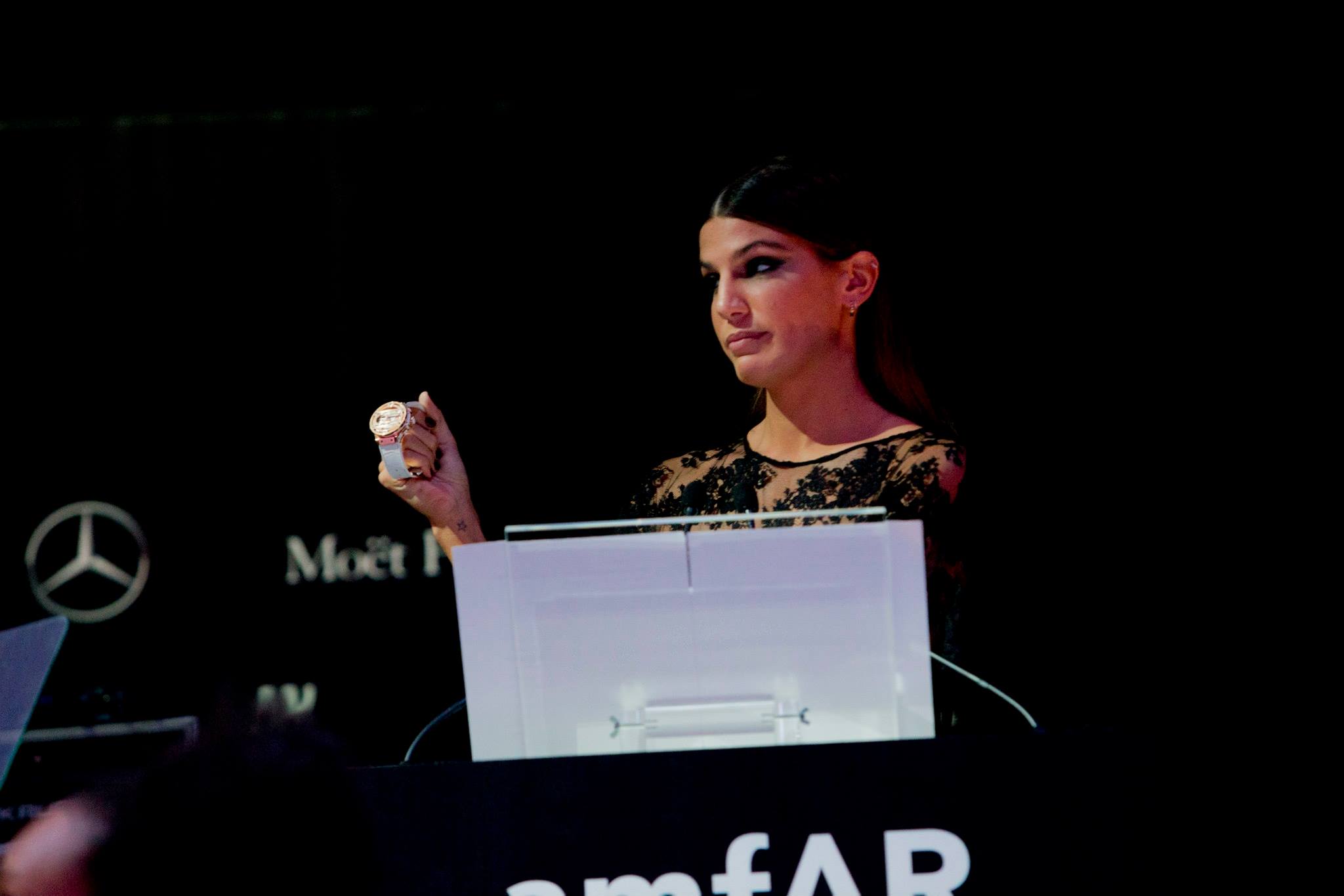 Este año Hublot decidió apoyar nuevamente a la amfAR, la Fundación para la Investigación del Sida. Este precioso reloj fue puesto a subasta durante la cena benéfica que fue conducida por Bianca Brandolini d' Adda. El Diseñador Roberto Cavalli y Reza Mostafavi, fueron los postores ganadores de esta pieza con 110,000 euros.