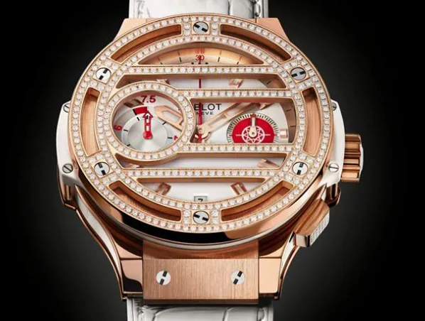 La caja y el bisel del Big Bang Costa Smeralda están hechos de oro rojo de 18 quilates pulido y satinado. La rejilla de oro rojo de 18 quilates pulida está engastada con 319 diamantes para un total de 1.49 quilates. Otros detalles notables incluyen una carátula blanca mate que luce el logotipo impreso “Costa Esmeralda” y una correa de caucho blanca y correa de piel de cocodrilo.