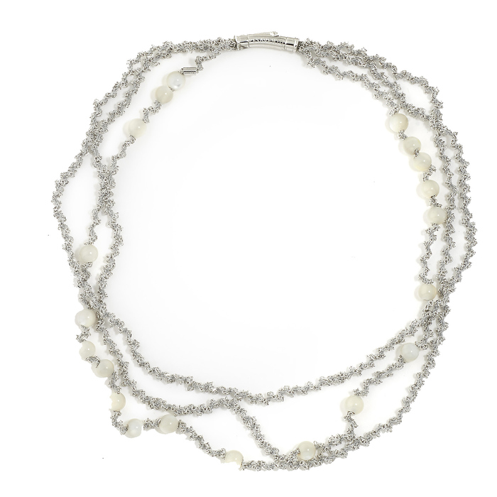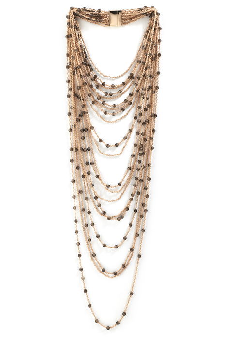 Como un cielo punteado de estrellas, las estelas luminosas DNA se enriquecen con gemas naturales. Cuarzo fumé, espinela y nácar iluminan los collares degradantes de varios hilos dibujando constelaciones de luz. El éxito DNA se renueva con tonos nuevos y elegantes: cuarzo fumé con rosa/polvos, nácar con rodio/hielo o rosa/marrón, espinela negra con rutenio/negro o rodio/negro.
