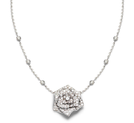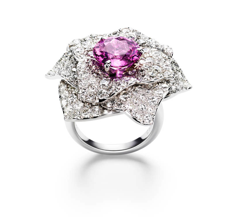 Presente en las líneas de un simple pendiente al igual que en un anillo engastado con 158 brillantes y una gota de rocío de zafiro rosa de 5.1 quilates, la rosa de Piaget tiene carácter y transmite emoción.