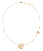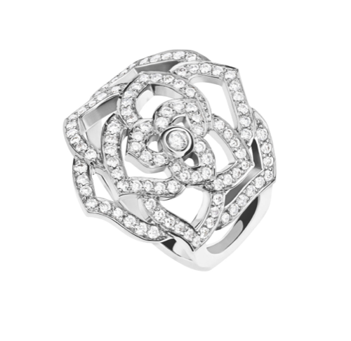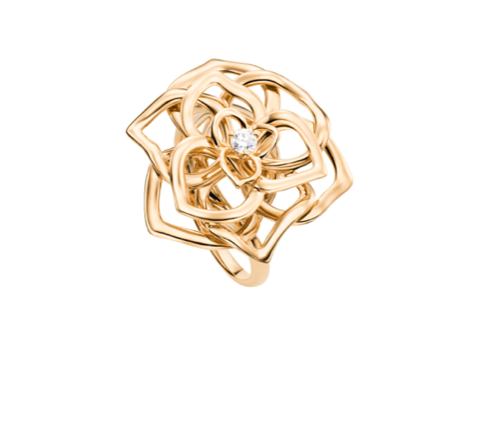 Sus pétalos calados son una caricia, como una huella preciosa a flor de piel. Con una dulce sensualidad, sus pétalos entrelazados y sinuosos diseñan, a través del oro y algunas veces entre los diamantes, una rosa en movimiento de exquisita delicadeza.