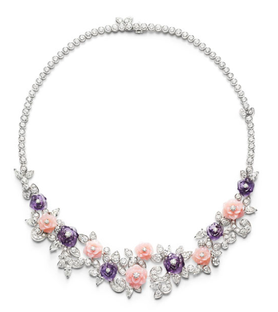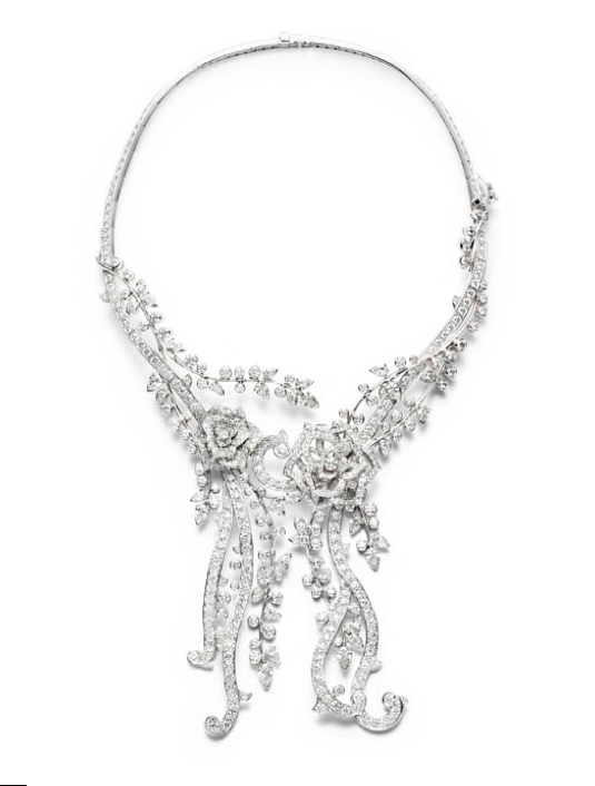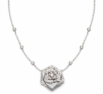 De oro y diamantes, desvela en su corazón una gota de rocío sublimado por la más luminosa de todas las piedras. Con sus voluptuosas formas, sus pétalos –estilizados e íntegramente engastados con diamantes-, se alborozan con sus generosos volúmenes, como una auténtica rosa.