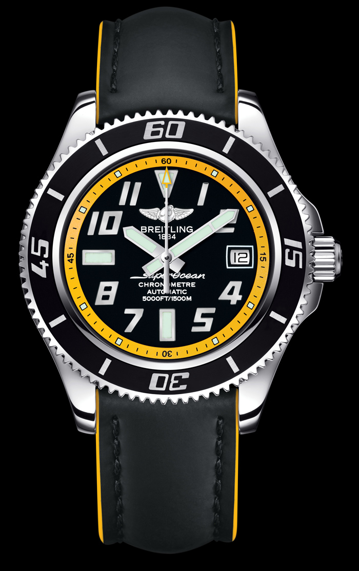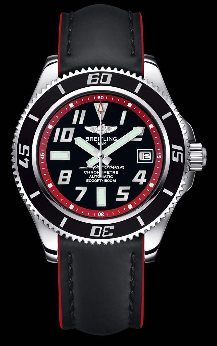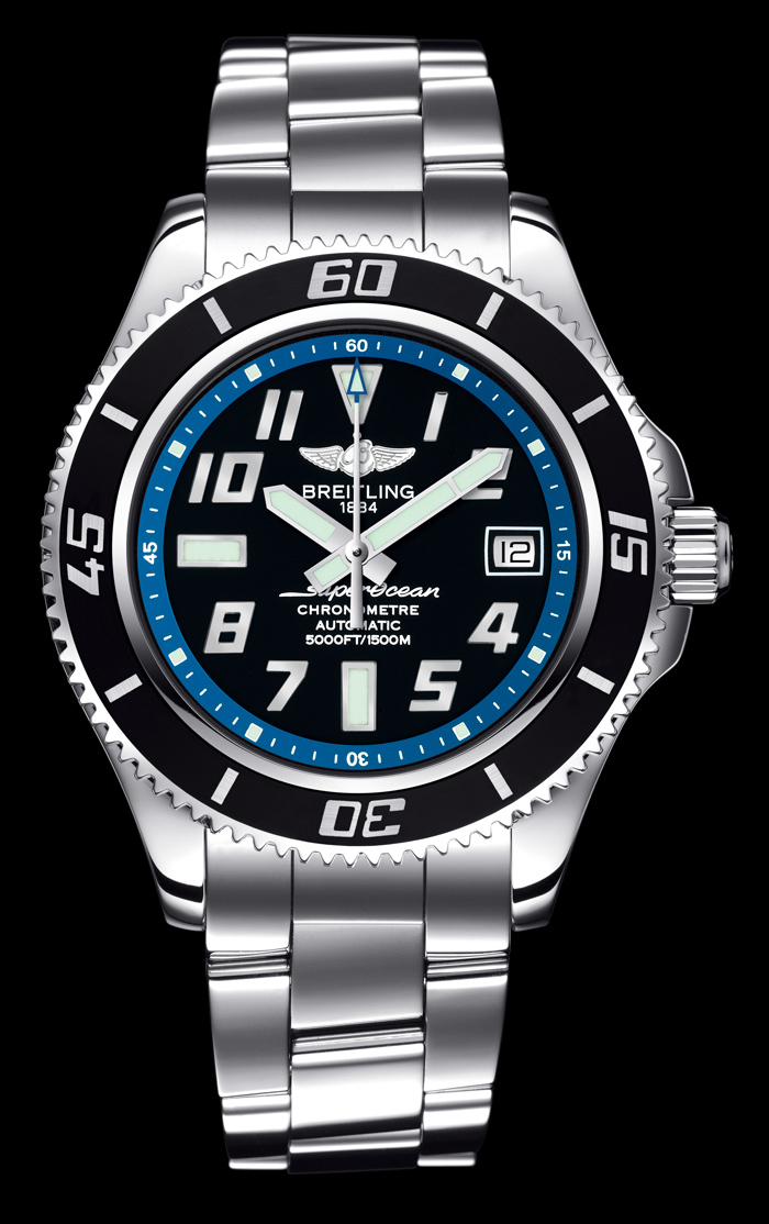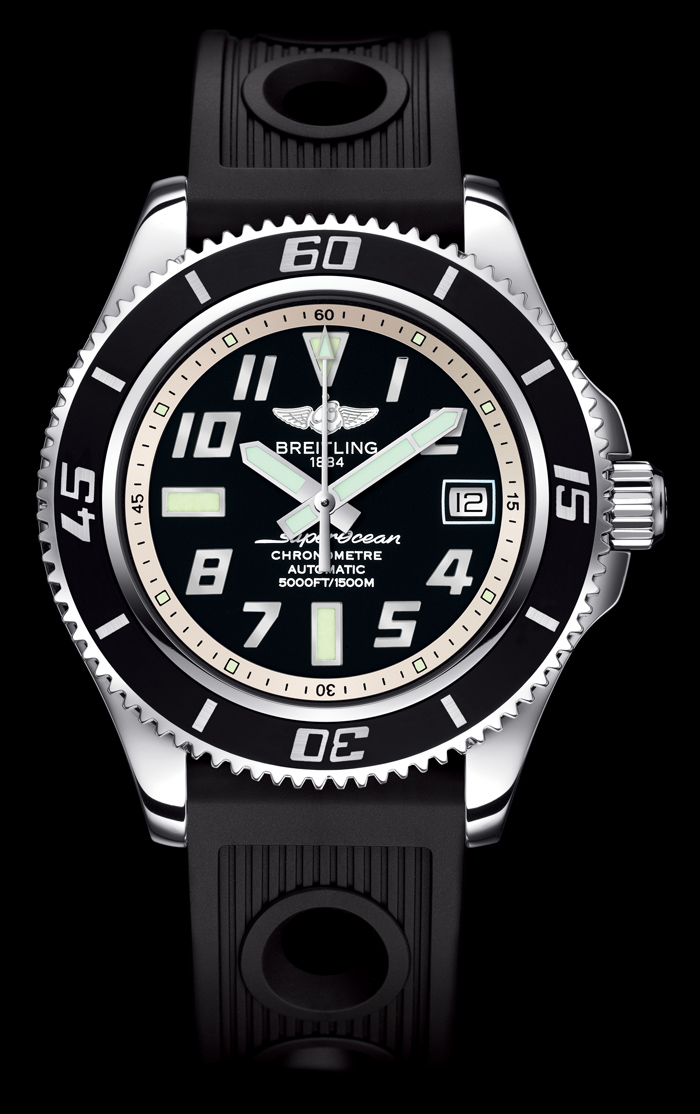 - Superocean 42, modelo que reúne la tradición de esta marca suiza, práctico y vanguardista; otorga a todas las muñecas un estilo audaz sin importar si se está practicando submarinismo o si se utiliza de forma cotidiana en la ciudad. Tiene una caja ultra robusta de acero sumergible hasta 1,500 metros, así como un bisel giratorio unidireccional con perfil acanalado que va recubierto con un sobremoldeado de caucho. Dicha tonalidad también está presente en la esfera dotada de índices y agujas luminiscentes así como en la pulsera de caucho con la firma Breitling® en relieve.