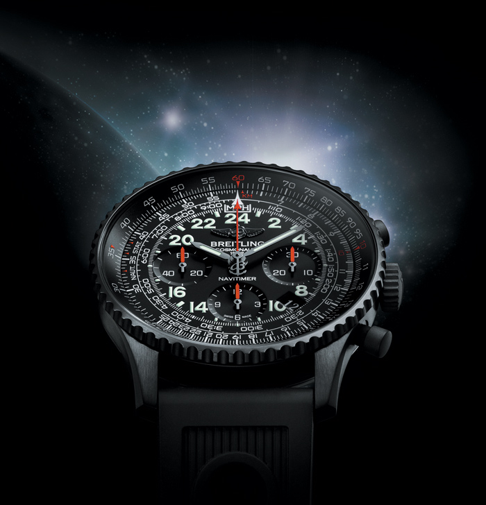 - Navitimer Cosmonaute, un reloj de 24 horas, cronógrafo y acero DLC.