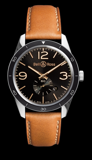 BR 123 Golden Heritage – Inspirado diréctamente en los relojes antiguos, esta pieza es una versión sofisticada del modelo 123 Sport Heritage, y fiel a los códigos estéticos. Caja de acero inoxidable con bisel de aluminio negro graduado con 60 minutos y carátula negra con números árabes a fin de garantizar la visibilidad perfecta. Se abraza mediante una correa de piel de becerro gold.