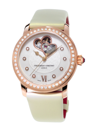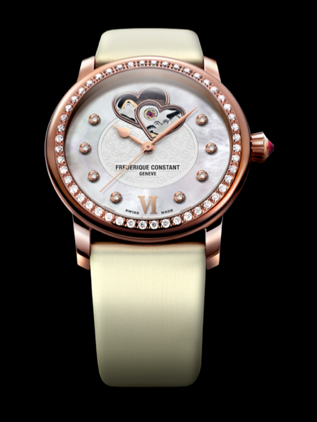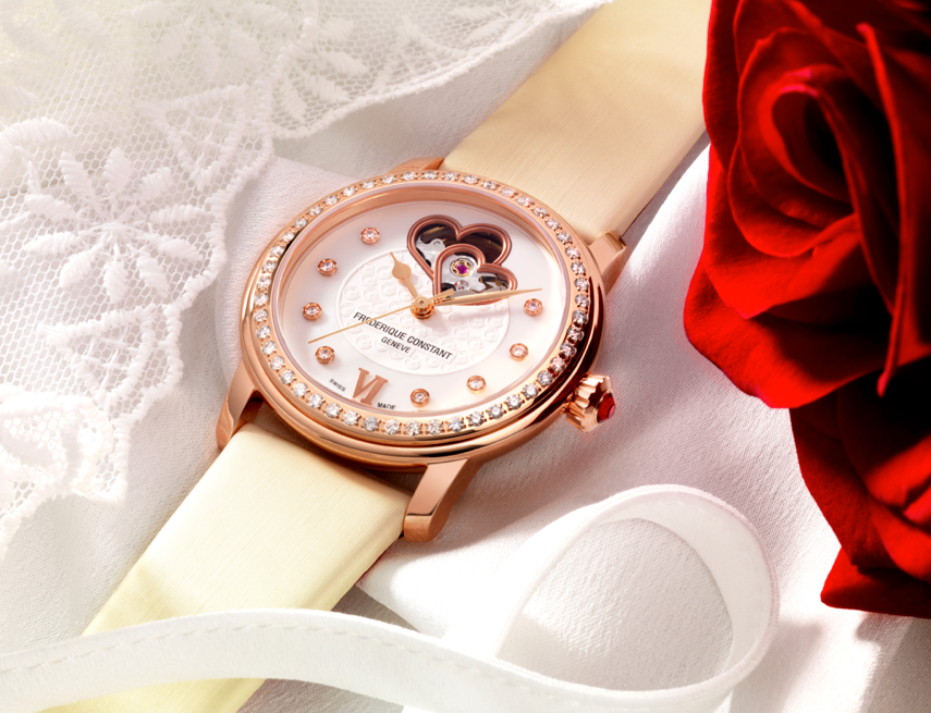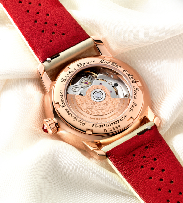 La pieza destinada al apoyo del organismo está hecha en caja de acero inoxidable, y engastado con 48 diamantes en el bisel, mientras que se abraza a la muñeca mediante una correa de satín con lino rojo. Al interior late un corazón mecánico automático calibre FC-310 con 38 horas de autonomía y hermético hasta los 60 metros, mismo que puede ser visto por la apertura en la carátula color vainilla.