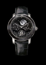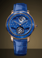 Adicionalmente, la caja de 46 mm de diámetro está construida en oro rosa de 18 quilates, mientras que la Vía Láctea se exhibe en la carátula con diamantes y coronada por un zafiro azul, la Luna se presenta pintada a mano. Finalmente, la correa de piel de cocodrilo a juego con la versión de su predilección.