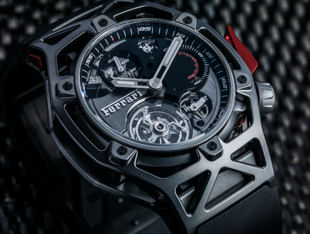 Este reloj creado por el 70º aniversario de Ferrari y limitada a 70 piezas, se destaca por tener un cronógrafo tourbillon que late a una frecuencia de 3 Hz. Su caja de oro esqueletada con acabados de titanio brillante protegida por un cristal de zafiro antirreflejante permite su total admiración al interior. A través de una correa de caucho negra lisa intercambiable, el Techframe Ferrari Tourbillon Chronograph se abrazará con firmeza al pulso de la muñeca soportando hasta 30 metros debajo del agua.