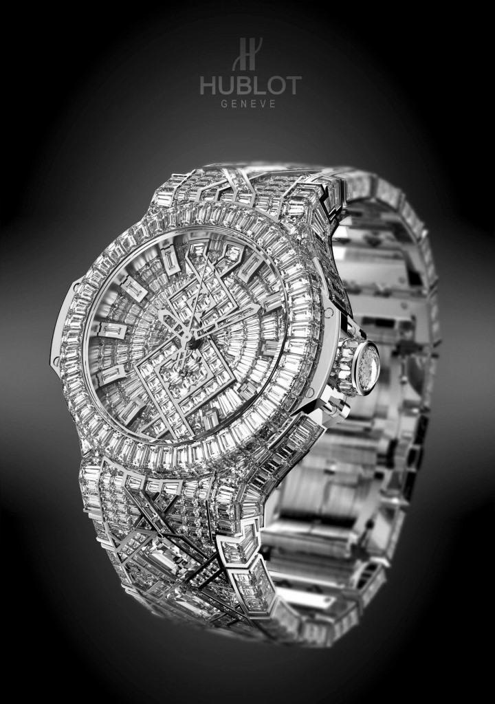 WW-VERANO 2012. Un total de 1,282 diamantes -más de 100 quilates corte baguette-, dan vida al reloj más preciado jamás creado por Hublot: el “US $5 Million”. La excepcional pieza es producto de 14 meses de trabajo de cada una de las diferentes disciplinas implicadas en su desarrollo. El también reloj más caro de Baselworld 2012, puede considerarse una verdadera obra de arte debido a la espectacular labor realizada por los mejores artesanos en su campo.
