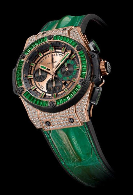 La relación de HUBLOT con el Consejo Mundial de Boxeo data de una bella iniciativa que entregó 12 piezas a grandes campeones, seguida de una subasta en donde otra media docena –idéntica– grabada fuera puesta en subasta a fin de obtener recursos para la manutención de boxeadores que viven actualmente en condiciones desfavorables. Finalmente, la pieza única entregada al boxeador cuenta con un movimiento mecánico automático calibre HUB4100 al interior de una caja de “King Gold” de 48 mm de diámetro, que además está engastada por 248 diamantes y 48 tsavoritas. Posee el logo del WBC grabado en el anverso y se abraza a la muñeca mediante una correa de piel de cocodrilo color verde cosida a caucho. ¿Y tú, quién crees que ganará? Let´s get ready to rumble…