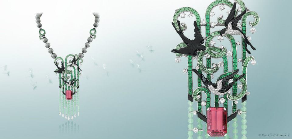 - Collar Hirondelles de Van Cleef & Arpels. El pendiente puede desprenderse y convertirse en un prendedor. Esta creación está elaborada en oro blanco, diamantes, esmeraldas, perlas y onix.