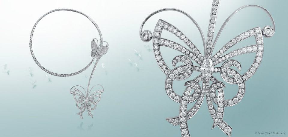 - La gargantilla Flying Butterfly en oro blanco y diamantes puede desprenderse y ser utilizada solo como prendedor.