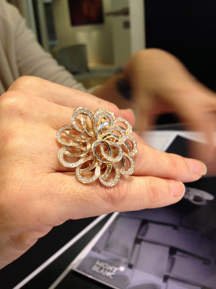 - El anillo que podemos llamar Tourbillon, engarzado de giros de los ya conocidos pétalos de rosa que se han convertido en otro ícono de la joyería Montblanc.